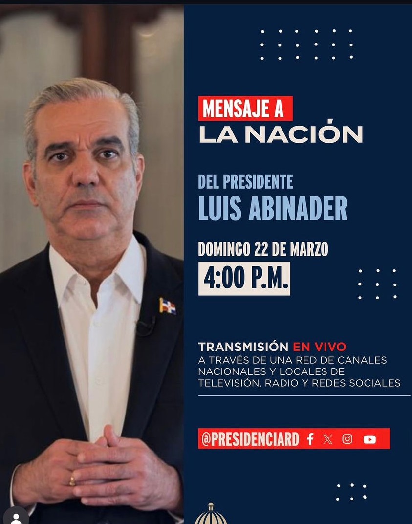 La Presidencia de la República informó que el mandatario dominicano, Luis Abinader, dirigirá un mensaje a la nación este domingo 22 de marzo a las 4:00 de la tarde. El anuncio fue realizado a través de las redes sociales oficiales de la Presidencia, donde se invitó a la ciudadanía a mantenerse atenta a la transmisión.